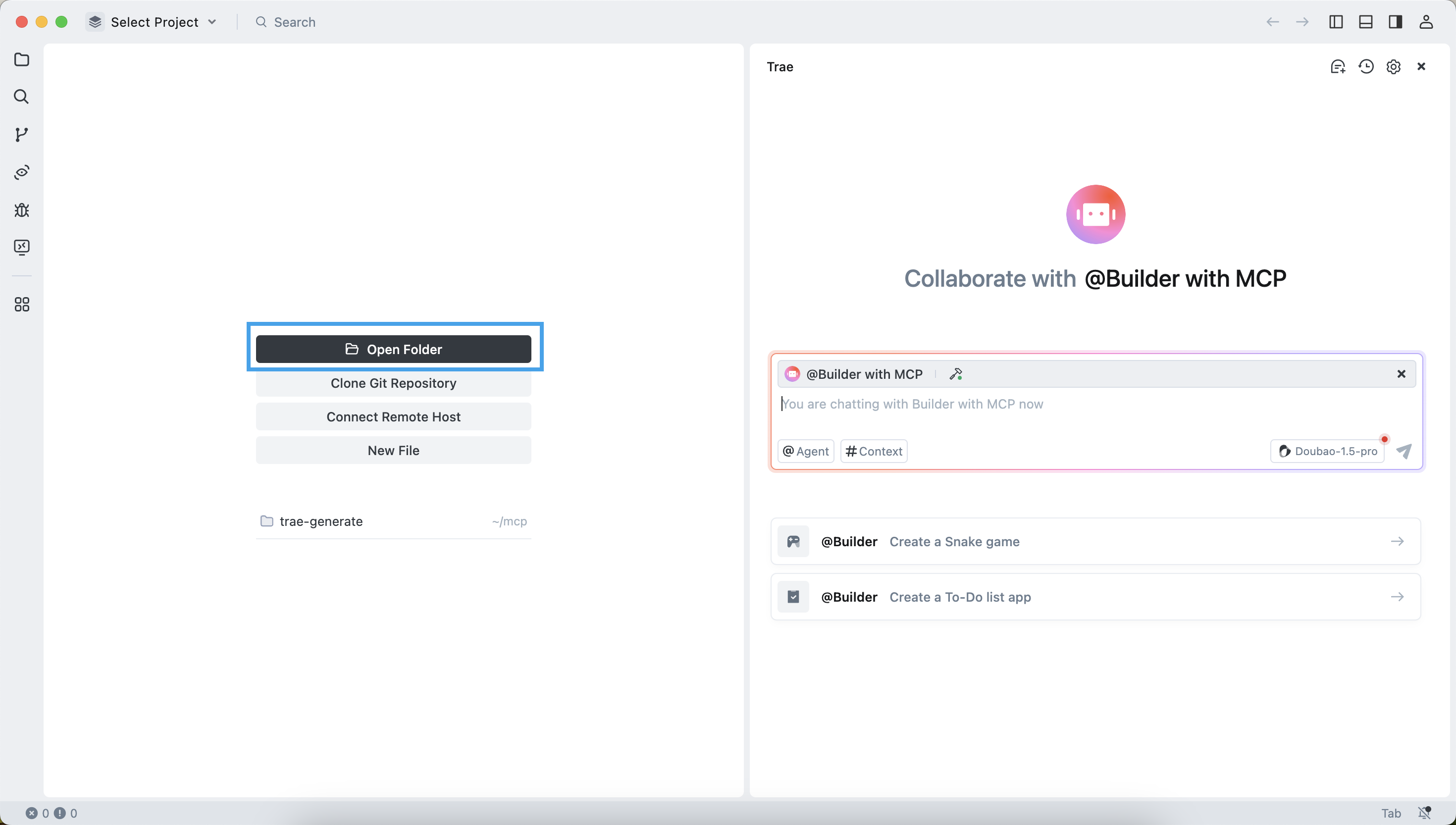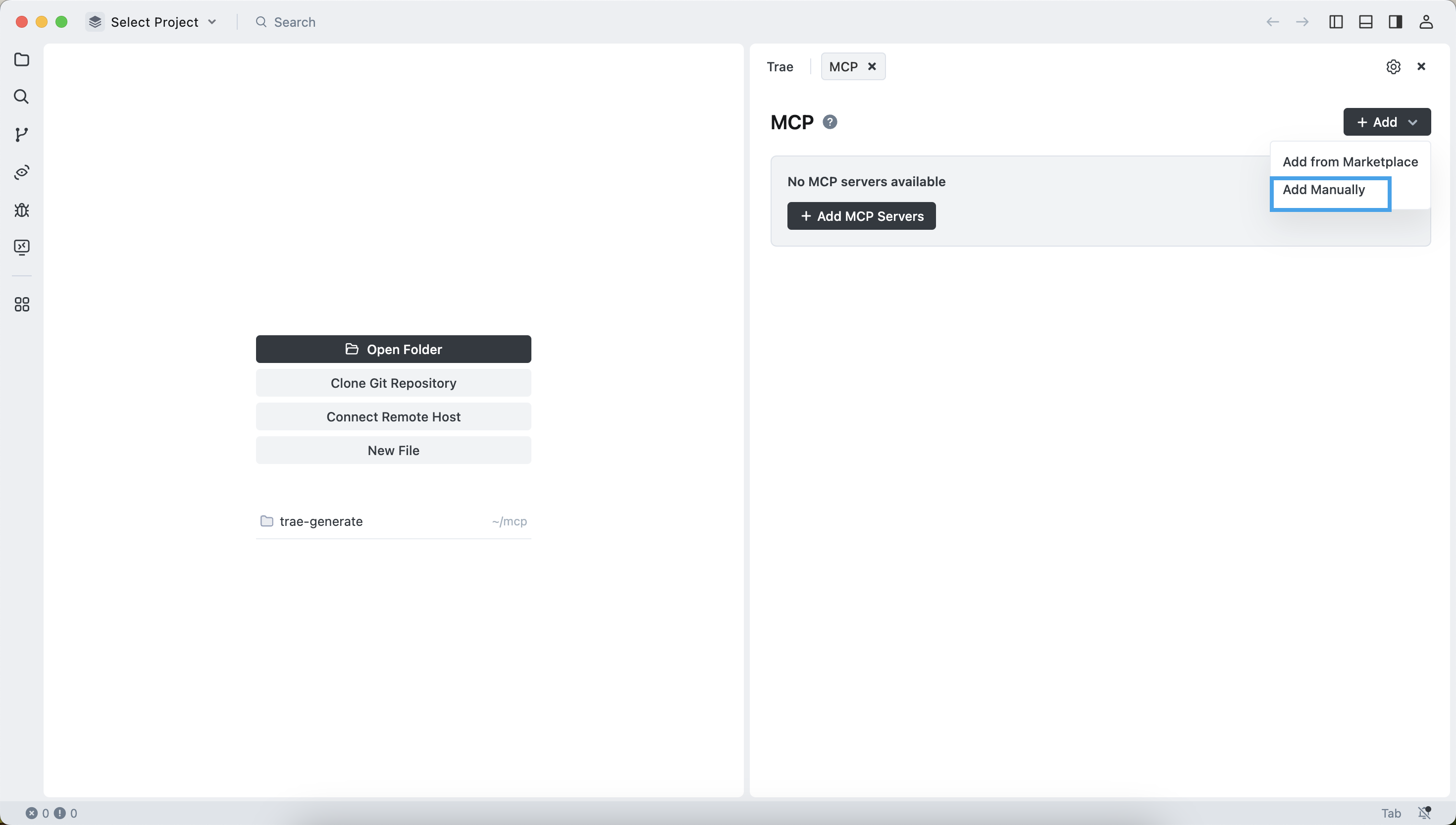 Manually create a working directory for TRAE and open it. TRAE will generate files in this directory. The example directory name is trae-generate.