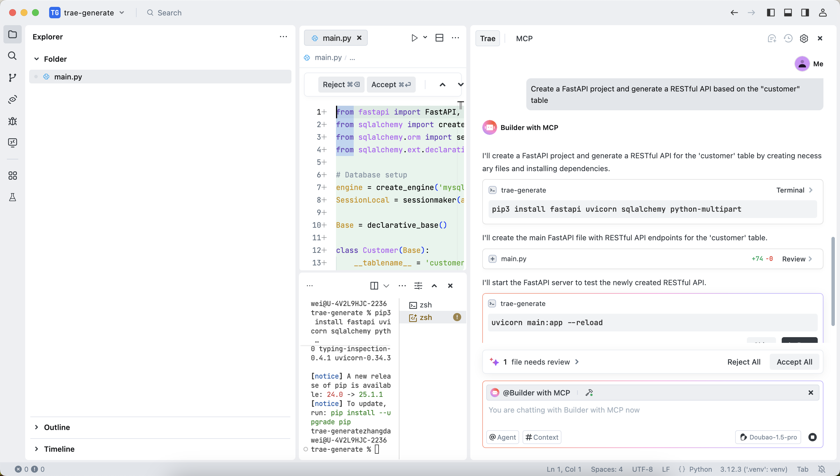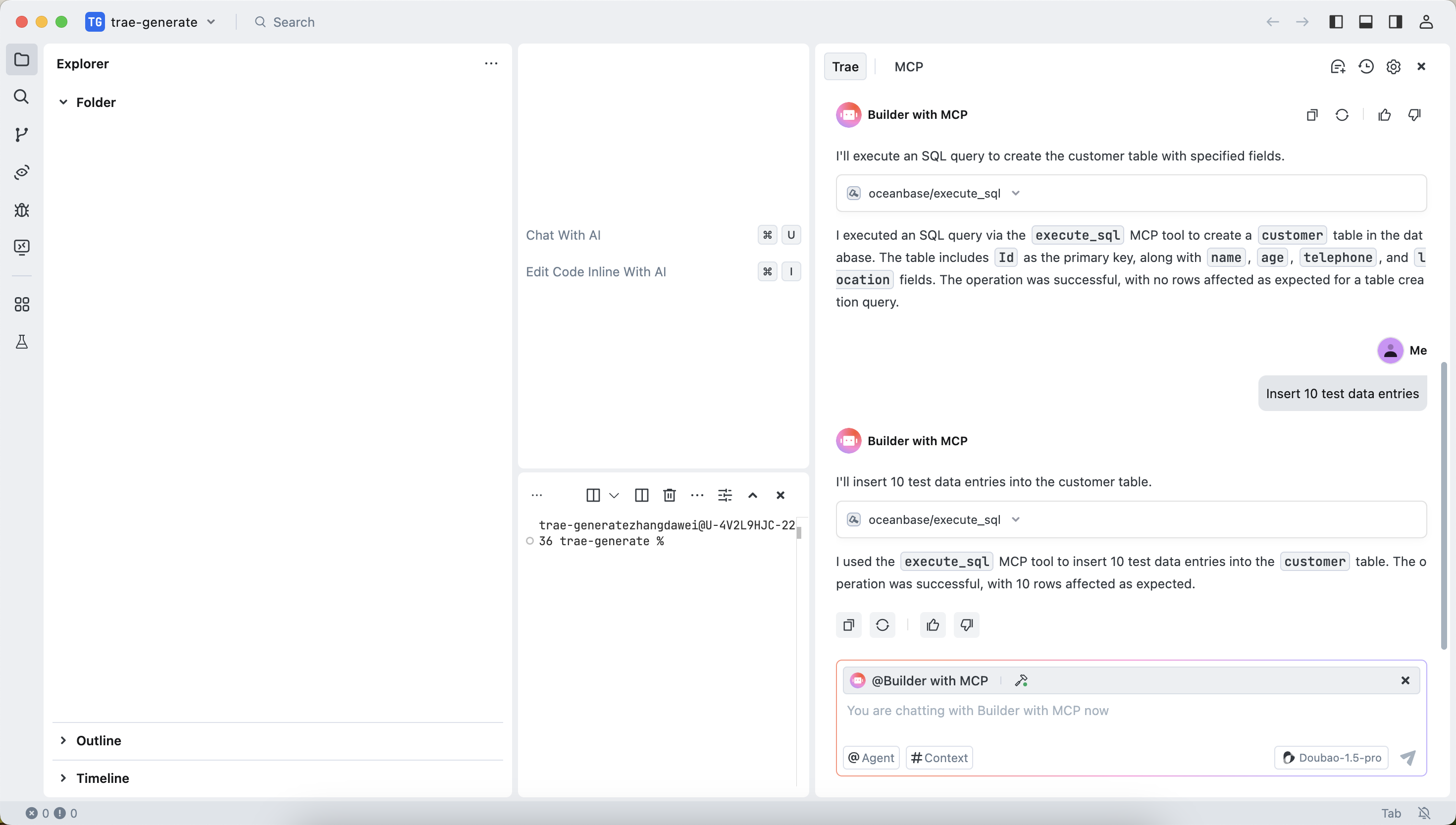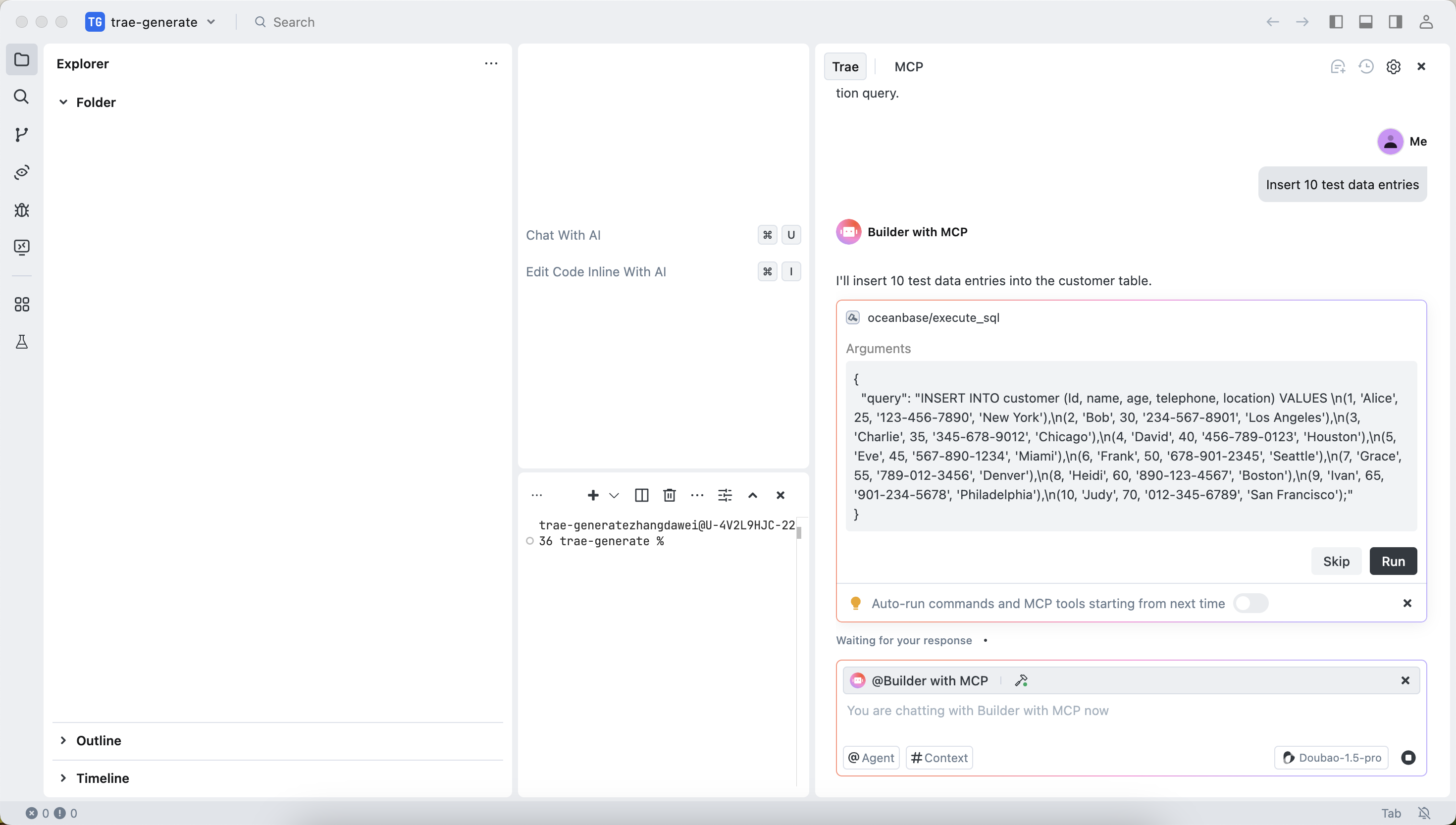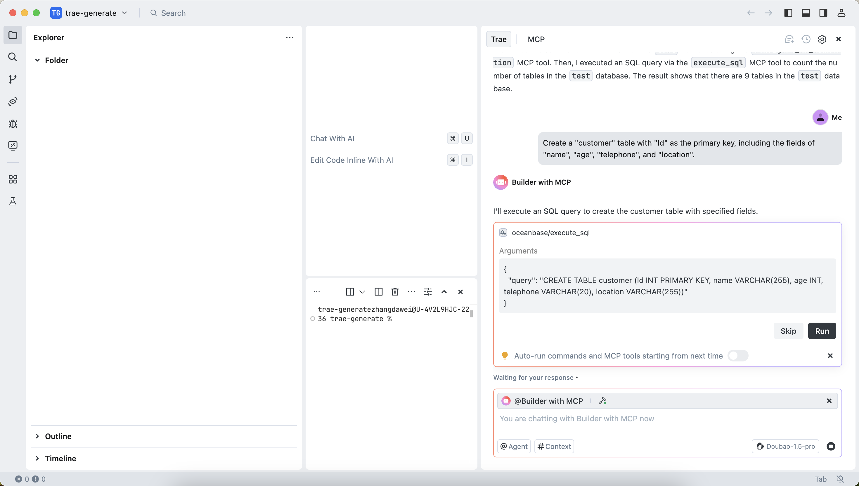 This topic will guide you through the process of integrating TRAE IDE with OceanBase MCP Server to quickly build a backend application.