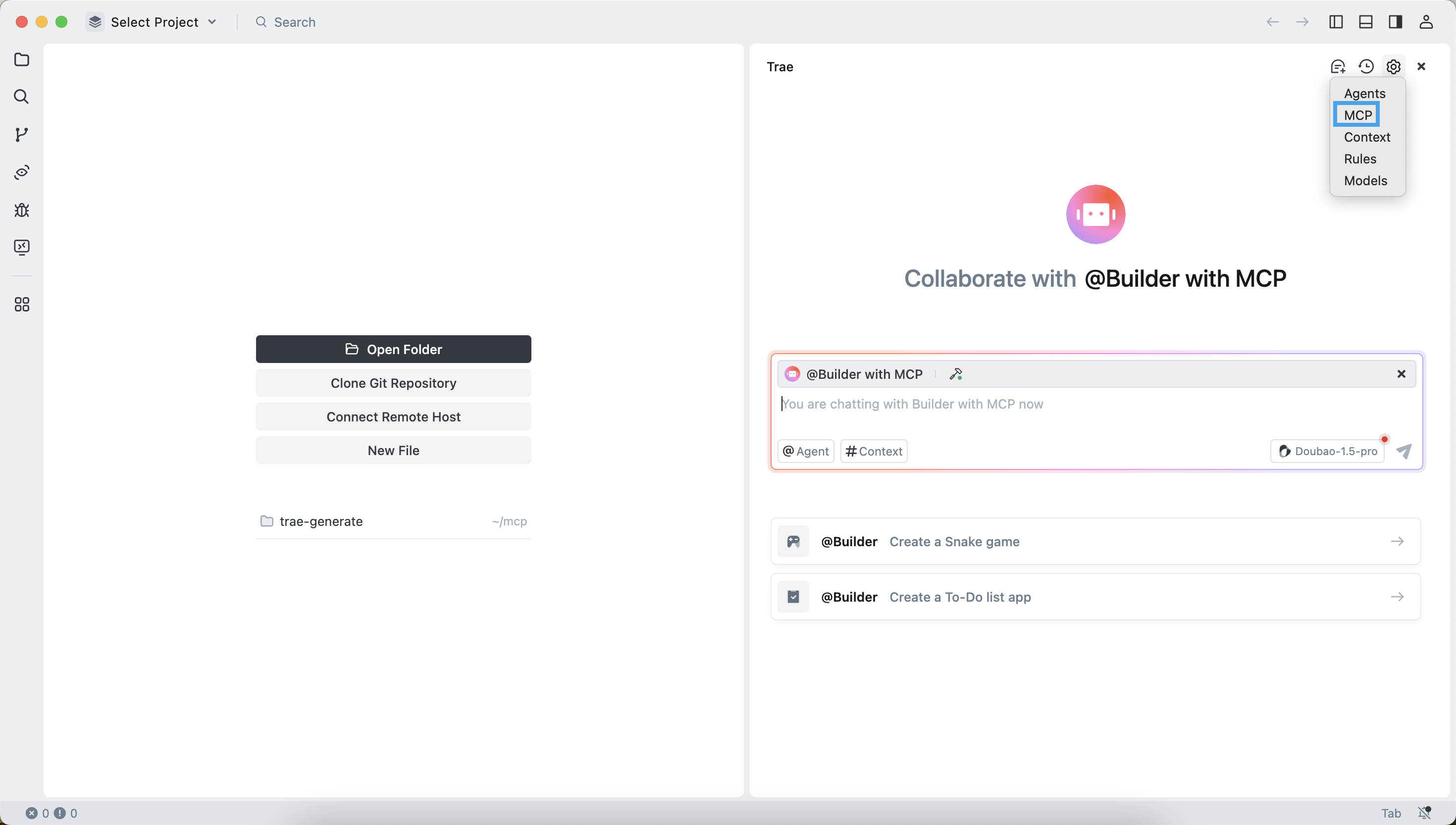Press Ctrl + U (Windows) or Command + U (MacOS) to open the chat box. Click the gear icon in the upper-right corner and select MCP.